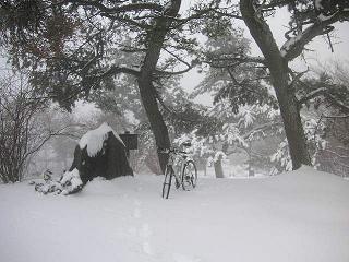 新雪の中に踏み入って、 右上の東屋まで登ってみました。