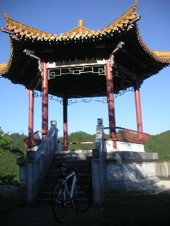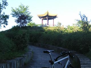 ちょうど自転車で登れる傾斜のスロープをうねうね行くと、視線の先にはいかにも中国な東屋がそびえているではありませんか。