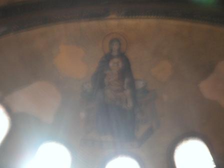 聖堂の内部です。突き当たりに見えるのがアプシスと呼ばれるくぼみで、天井の半ドームには聖母子像のモザイク画が描かれています。 ちなみに私の写真はこちら。